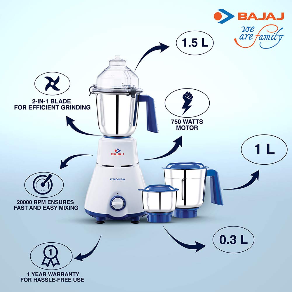 Bajaj Typhoon 750-Watt Mixer Grinder is a durable kitchen appliance made of stainless steel, which prevents rusting and has vacuum feet for easy operation. It comes with different stainless steel jars that allow versatile operations in the kitchen so that it can be used for multiple purposes. Though it has a powerful motor its weight is 3 Kg 620 g . It provides 3 Stainless Steel Jars - Liquidizing jar (1.5 Litre), Dry grinding jar (1 Litre), Chutney jar (0.3 Litre) , Unbreakable Jar lids and handles and Anti-Slip Jar Handles ,Spatula for easy removal of mix and change of blades ,Superior powerful performance and suitable for tough grinding with a 1 year warranty on product and motor.